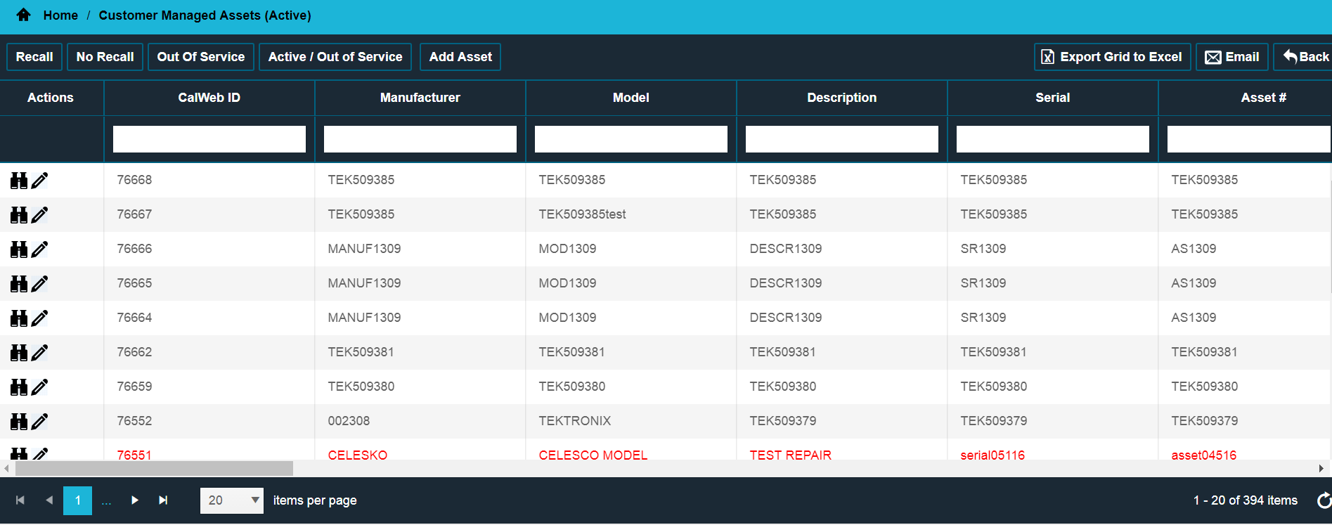 Drop-down: To filter using the drop-down, select an item from the list and click enter. For example: click the drop-down menu in the “Manufacturer” column, select a manufacturer, and click on enter. CalWeb filters out all assets except the selected manufacturer’s assets.